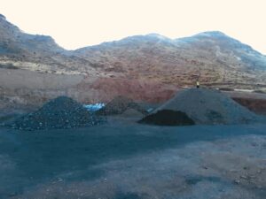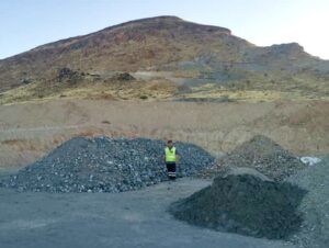 The benching process typically involves successively cutting berms alongside the mountain edge to expose underground material, at the same time ensuring the stability of the mountain structure. This process allows for the collection of graphite in stages as the plaforms are constructed on the Aukam mountain.